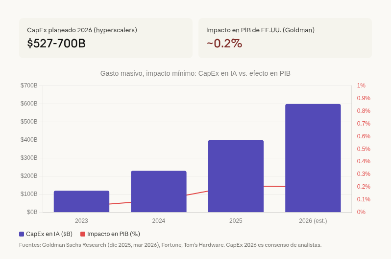 Goldman Sachs le puso número a lo que muchos sospechábamos: el impacto de toda la inversión en IA sobre el PIB de Estados Unidos en 2025 fue, en palabras de su economista jefe Jan Hatzius, "básicamente cero." Esto con $700 mil millones planeados solo para 2026 en infraestructura.