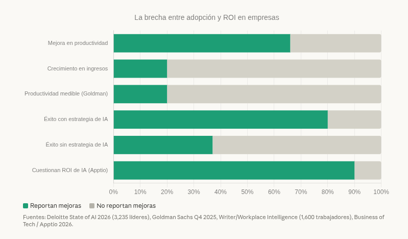 Resulta que no soy un caso aislado. Deloitte encuestó a más de 3,200 líderes empresariales en 2025: el 66% dice que la IA mejoró su productividad, pero solo el 20% — uno de cada cinco — reporta crecimiento real en ingresos. El 74% restante lo clasifica como "aspiración futura." Bonita manera de decir que el cheque no ha llegado.
