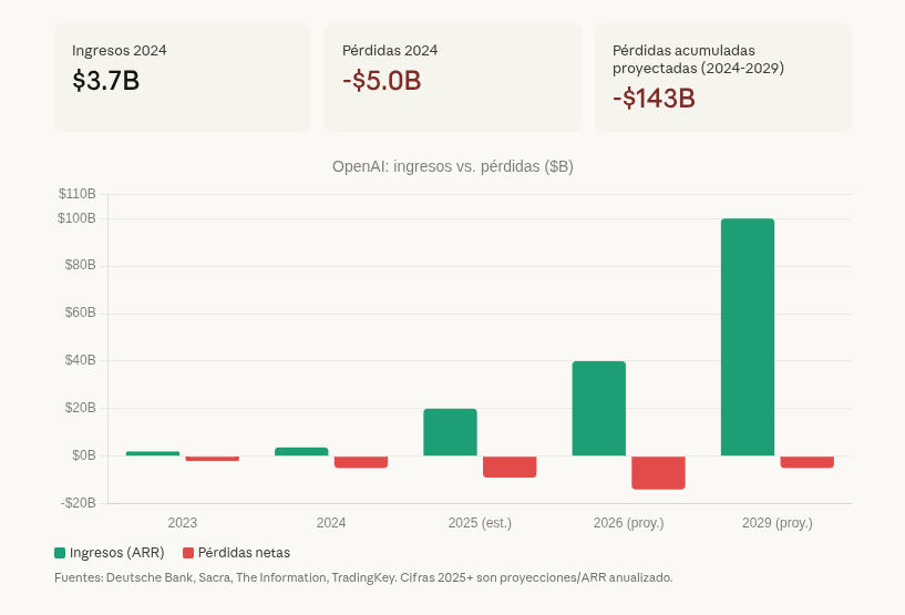 OpenAI facturó $3.7 mil millones en 2024. Perdió $5 mil millones. Lean eso otra vez: gastó $2.25 por cada dólar que generó. Para 2025, el ARR subió a unos $20 mil millones — crecimiento impresionante — pero la quema de efectivo fue de $9 mil millones. Deutsche Bank proyecta $143 mil millones en pérdidas acumuladas antes de que OpenAI vea rentabilidad, algo que no esperan antes de 2029. Paul Kedrosky lo puso en términos simples: "Están vendiendo dólares a 70 centavos al por mayor."