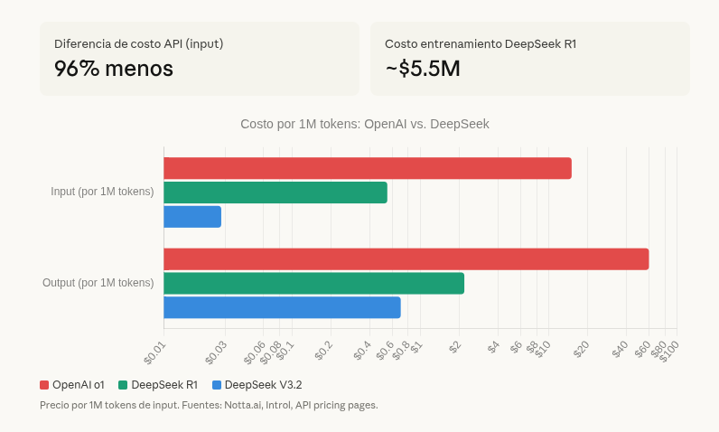 DeepSeek, un laboratorio chino, entrenó su modelo R1 por algo así como $5.5 millones, usando GPUs inferiores a las que tiene cualquier big tech americana. El resultado: rendimiento comparable al modelo o1 de OpenAI. El costo de su API es un 96% menor — $0.55 por millón de tokens de entrada contra $15 de OpenAI.