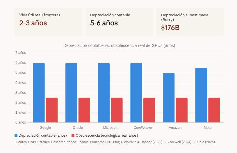 Sin embargo, Google, Oracle y Microsoft deprecian esos mismos chips contablemente a 5-6 años. Michael Burry — el inversor que anticipó la crisis de 2008 — estima que esa discrepancia podría representar $176 mil millones en depreciación subestimada entre 2026 y 2028. Ganancias infladas artificialmente.